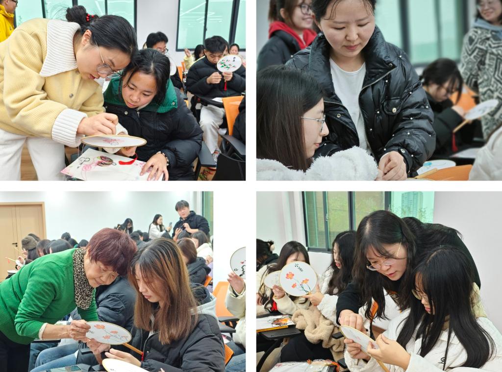 体验环节更是将活动推向了高潮。在科普团队的指导下,学生们拿起绣花针,在团扇上尝试绣制简单的湘绣图案。志愿者们以针为笔、以线晕色,耐心示范、悉心教学,学生们围绕“二十四节气”这一主题,一针一线地绣出了自己对非遗湘绣文化的热爱以及对中国传统节气的理解和感悟。