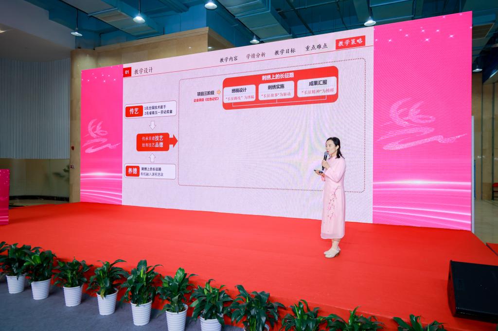 本次参赛团队由刘艳冰、吴晶慧、廖瑜三位老师组成。在比赛中,廖瑜老师全面介绍了《写意风景刺绣》课程的整体实施报告,刘艳冰老师进行了现场教学演示,该课程紧密围绕“红色记忆”这一核心主题,创新性地融合了长征路线于绣稿设计中,通过刺绣艺术精准再现长征中重要的地标建筑,同时以长征故事为教学引子,以长征精神为学习典范,成功地将思想政治教育与专业教学紧密结合。团队成员凭借其深厚的专业素养、精湛的教学技巧以及独具匠心的课程设计,赢得了大赛评委的高度认可。
