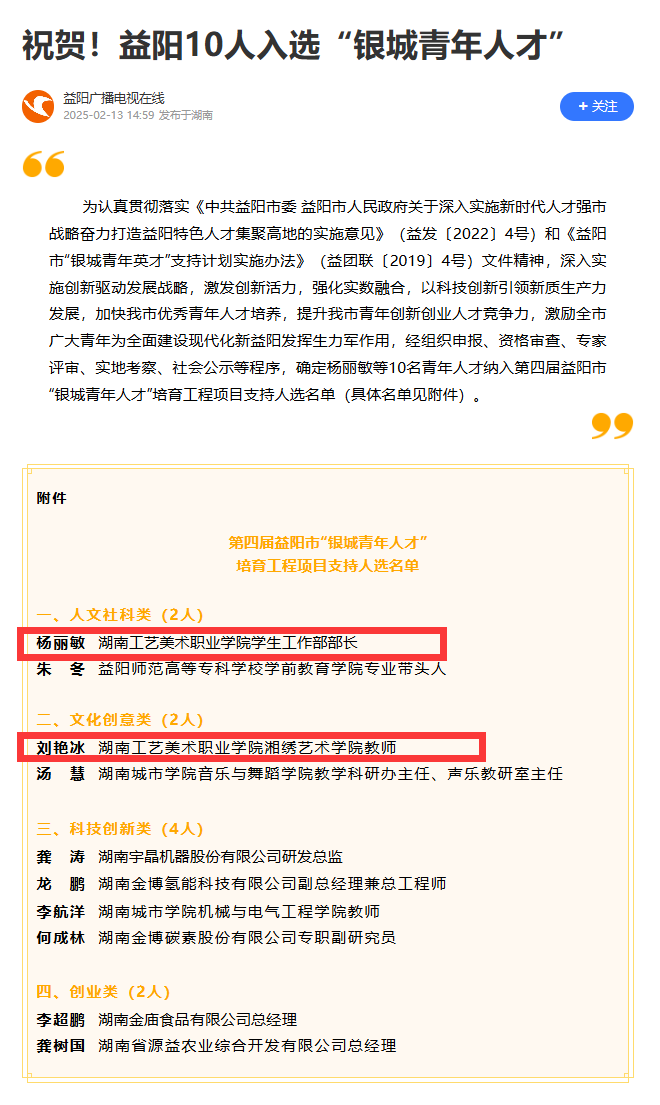 近日,益阳市公布了第四届“银城青年人才”培育工程项目支持人选名单,来自亚洲色欲色欲大片WWW无码-少妇邻居内射在线-色翁荡息又大又硬又粗又视频图片-国产精品毛片一区二区三区16-国语自产拍大学生在线观看“湘绣传承与创新黄大年式教师团队”的杨丽敏和刘艳冰两位青年教师荣获“银城青年英才”称号。这一荣誉不仅是对她们个人在湘绣传承与创新领域卓越贡献的肯定,也是对该教师团队整体实力和影响力的认可。