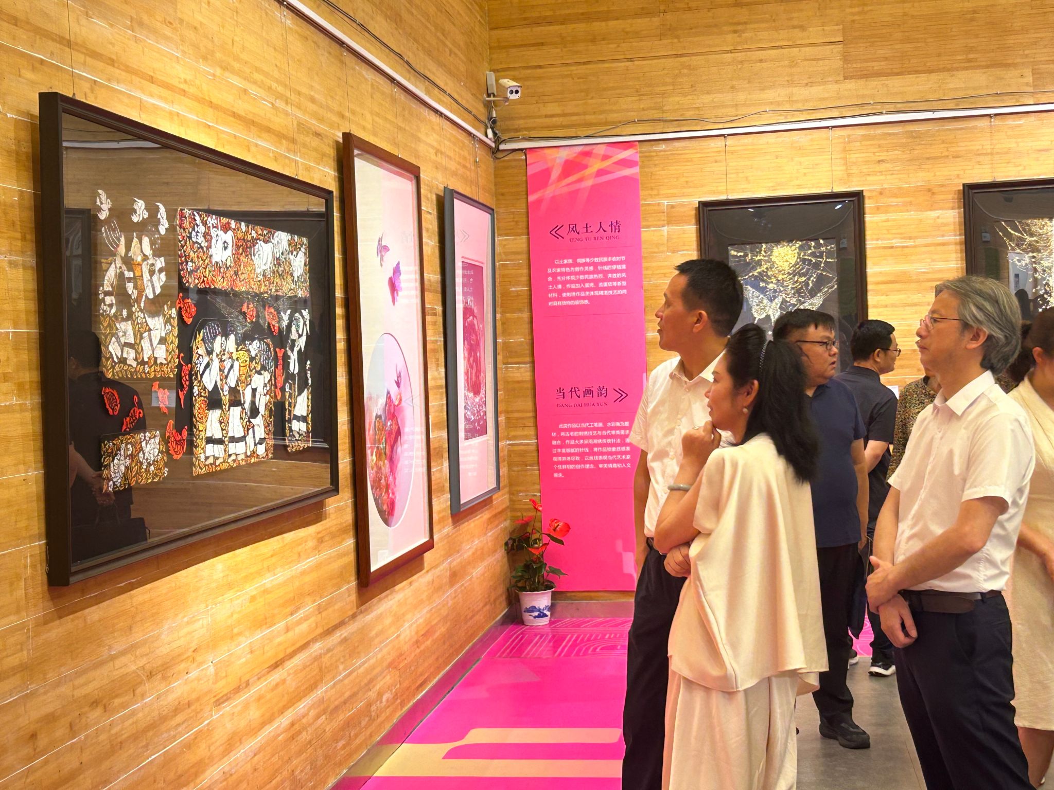在益阳美术馆,《生命系列》《蝶焰系列》等22幅作品吸引了众多领导嘉宾、外界友人和师生的目光,他们纷纷驻足观摩,对本次展览给予了高度评价。亚太地区手工艺大师、湖南升杉湘绣有限公司董事长李艳在观展后表示:“此次毕业作品在题材选择、工艺创新和装裱形式上均取得了显著突破,作品愈发新颖,展现了年轻创作者对传统技艺的深刻理解和大胆创新。”在长沙展区,新颖的作品同样吸引了大一、大二的学弟学妹及社会人员认真学习观摩。这些作品赋予了湘绣前所未有的视觉张力和表达维度,不仅体现了学生们扎实的专业技能,更反映出学院在人才培养方面的卓越成效。