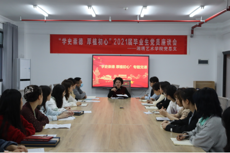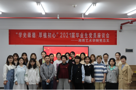21日上午,湘绣艺术学院党总支召开了“学史崇德、厚植初心”毕业生党员座谈会。4名学生党员围绕主题,结合大学生活,分享了入党后的切身感受,表达了对母校教育、党组织培养的感激之情,深情回忆了在美院度过的美好时光。她们表示将时刻牢记党的宗旨使命,牢记工匠精神,秉承“致用致美”的校训,在新的岗位上发挥先锋模范作用,为母校争光,用实际行动做好非遗湘绣传承。