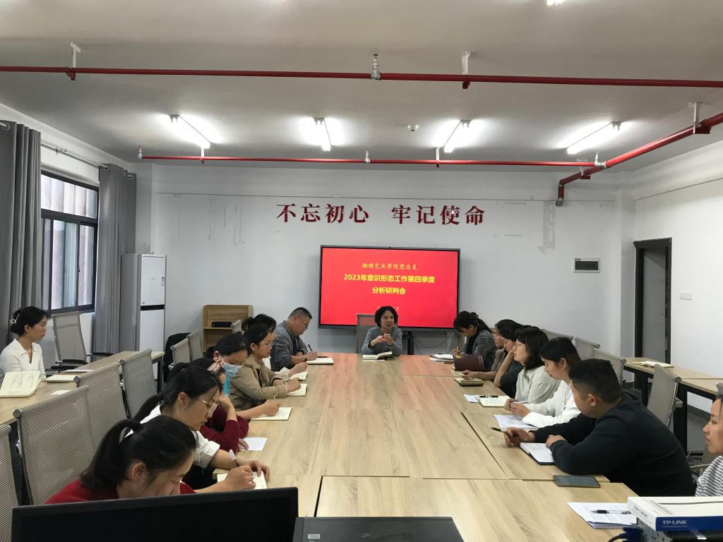 为进一步压实意识形态工作责任制,强化意识形态工作,11月6日,湘绣艺术学院党总支组织召开第四季度意识形态领域情况分析研判会议。学院党总支书记、院长唐利群,副书记蔡胜男,副院长吴俊及各辅导员、班主任等老师参加,会议由唐利群主持。