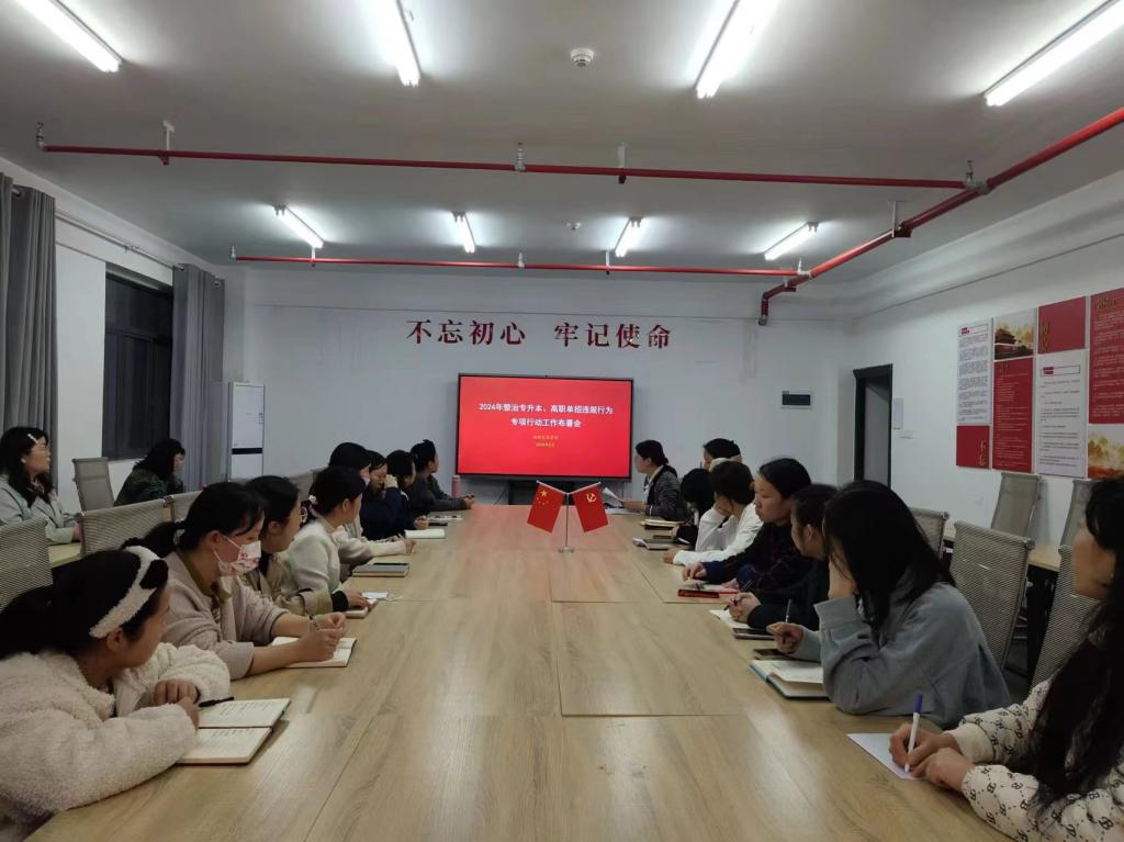 会议组织学习了湖南省教育厅《关于开展2024年社会机构涉专升本、高职单招违规行为专项整治的通知》文件精神,并对学院专项整治工作进行了安排部署。