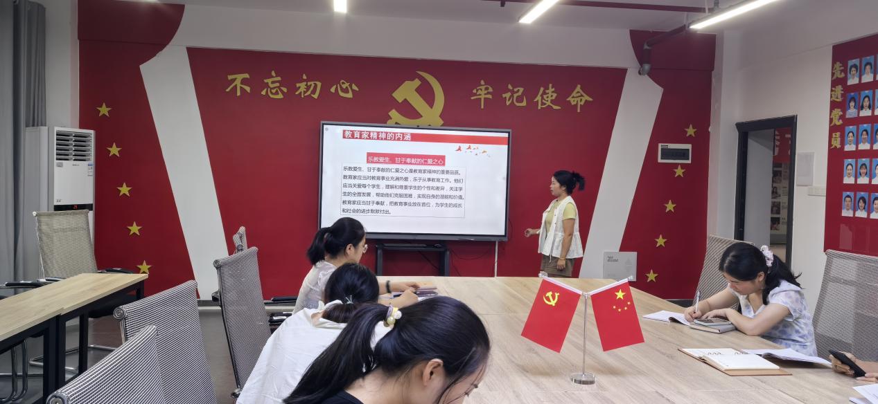 在“一课”环节,聂媛同志以《领悟教育家精神,争做四有好老师》为题讲授微党课,生动阐述了教育家精神的内涵以及如何在新时代背景下成为一名有理想信念、有道德情操、有扎实学识、有仁爱之心的“四有”好老师,引发了全体党员的深入思考与热烈讨论,进一步激发了大家的教育热情和使命感。