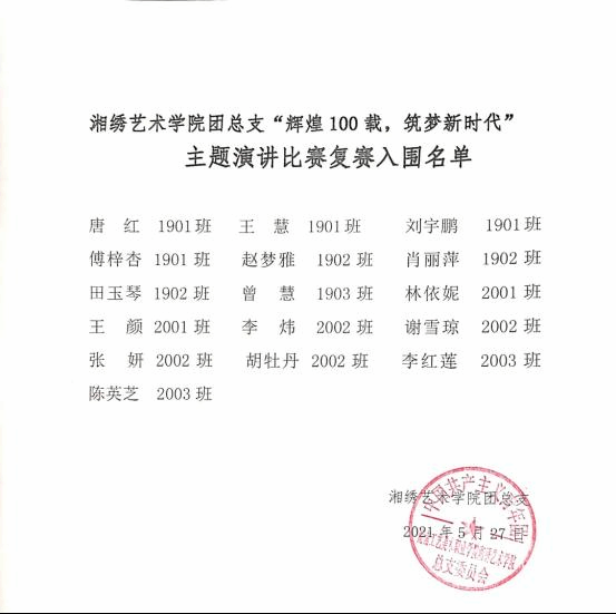 为庆祝建党百年,歌颂党的伟大成就,在学子心中厚植爱党爱国情怀,5月24日至26日,湘绣艺术学院团总支以各团支部为单位组织举行“辉煌100载,筑梦新时代”主题宣讲初赛。