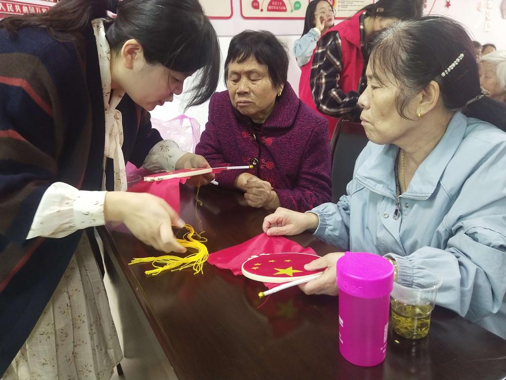 志愿者走进社区,受到了老人们的热烈欢迎,她们和老人一起绣制国旗和交流,氛围其乐融融。