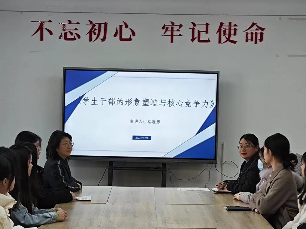 会上,党总支副书记蔡胜男以《学生干部的形象塑造与核心竞争力》为主题,从学生干部的重要作用、什么是学生干部、优秀的学生干部工作方法、如何提高学生干部的执行力等方面详细和学生干部进行交流;团总支书记杨荣对不同阶段学生干部的工作进行指导,要求学生干部明确自身定位,以理性的思维做好自己的本职工作,发挥好带头作用。