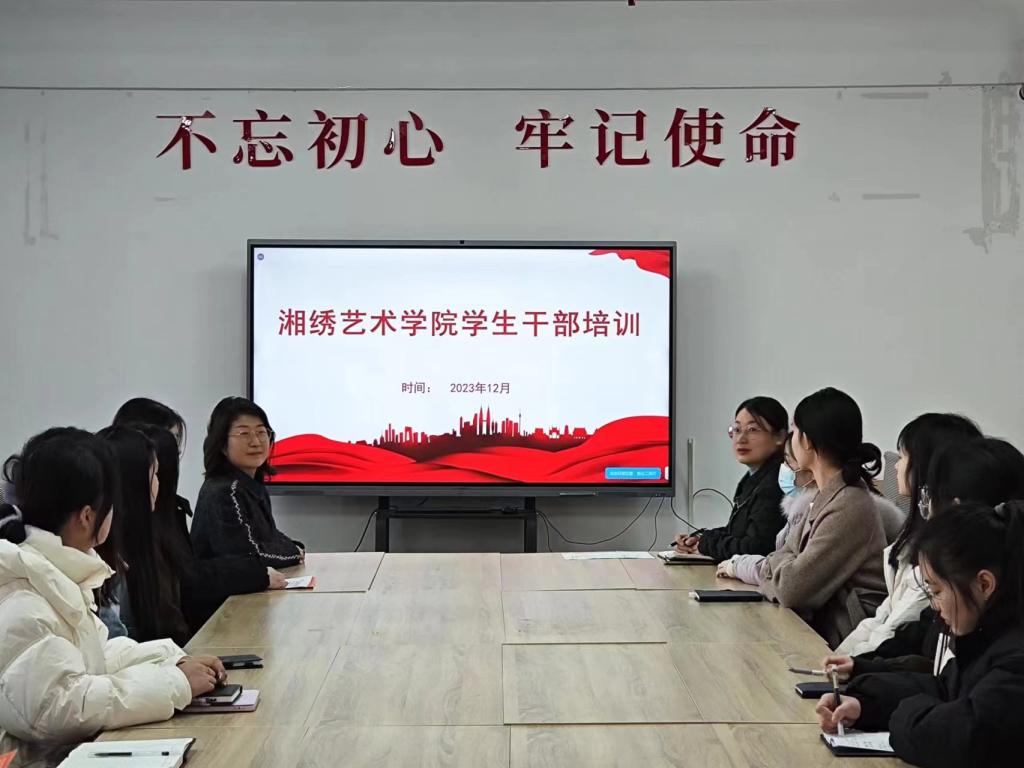 2023年12月22日中午,湘绣艺术学院在教学楼301教室举办“凝‘新’聚力展担当,踔厉奋发新征程”学生干部培训,学院党总支副书记蔡胜男、团总支书记杨荣及全体团学干部参加。