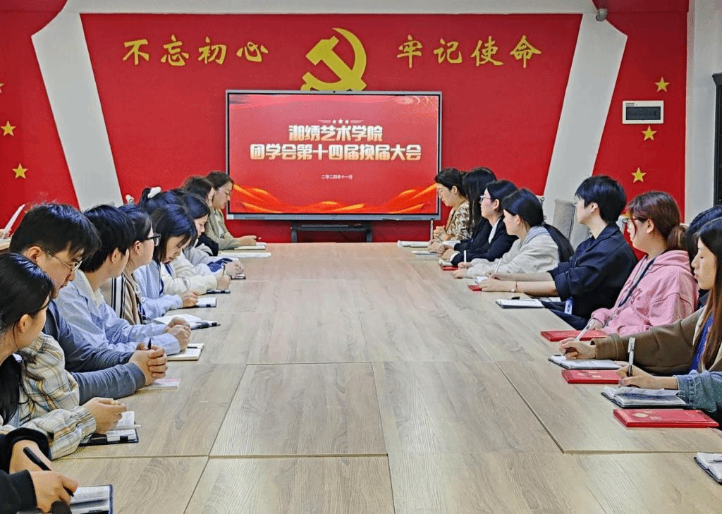 11月7日中午,湘绣艺术学院在教学楼301召开学院第十四届学生干部换届大会,学院党总支副书记蔡胜男、辅导员杨荣及团学会全体干部参加。