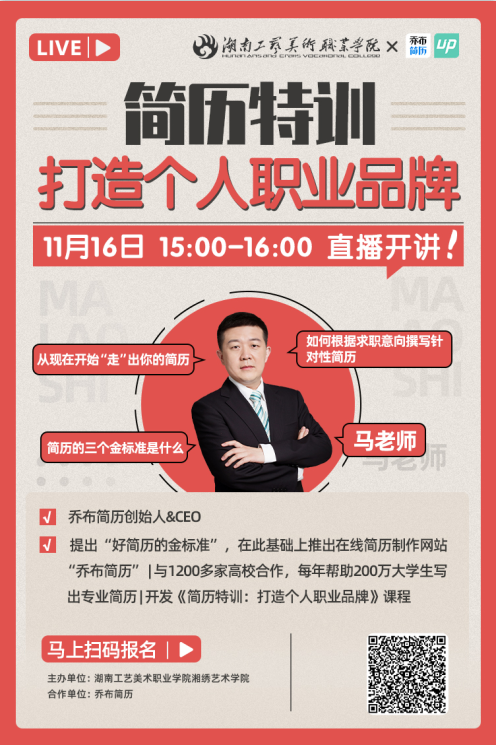 为进一步提升学生就业综合能力,帮助2022届毕业生顺利求职,促进高质量就业。11月16日,湘绣艺术学院在教学楼621举办了线上“简历特训营”,邀请乔布简历创始人&CEO马晓为我院2019级所有学生和2020级、2021级部分学生代表进行了专题培训。