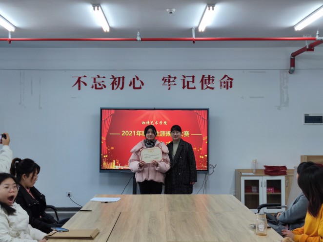 为增强大学生职业生涯规划意识,树立正确的择业观念,提升就业能力,我院于12月6日下午在教学楼301、304开展第六届职业生涯规划大赛,湘绣艺术学院党总支副书记蔡胜男、学工办主任杨荣、组织委员刘瑞林、招生就业专干朱婷四位老师担任评委。