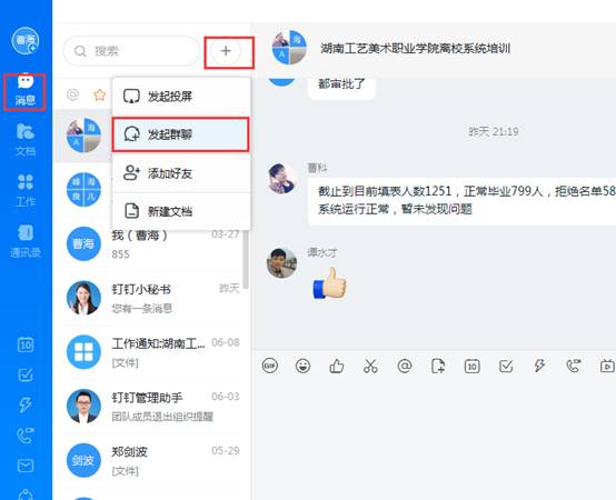 1. 钉钉电脑端“消息”,右上角“+”“发起群聊”建立群组,选择“按组织框架”邀请相关与会人员进入群组。