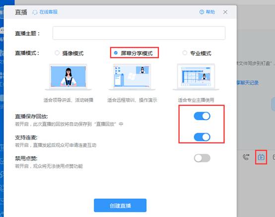 2. 点击聊天框“直播”按钮,填写“直播主题”,根据会议需求选择相应模式。