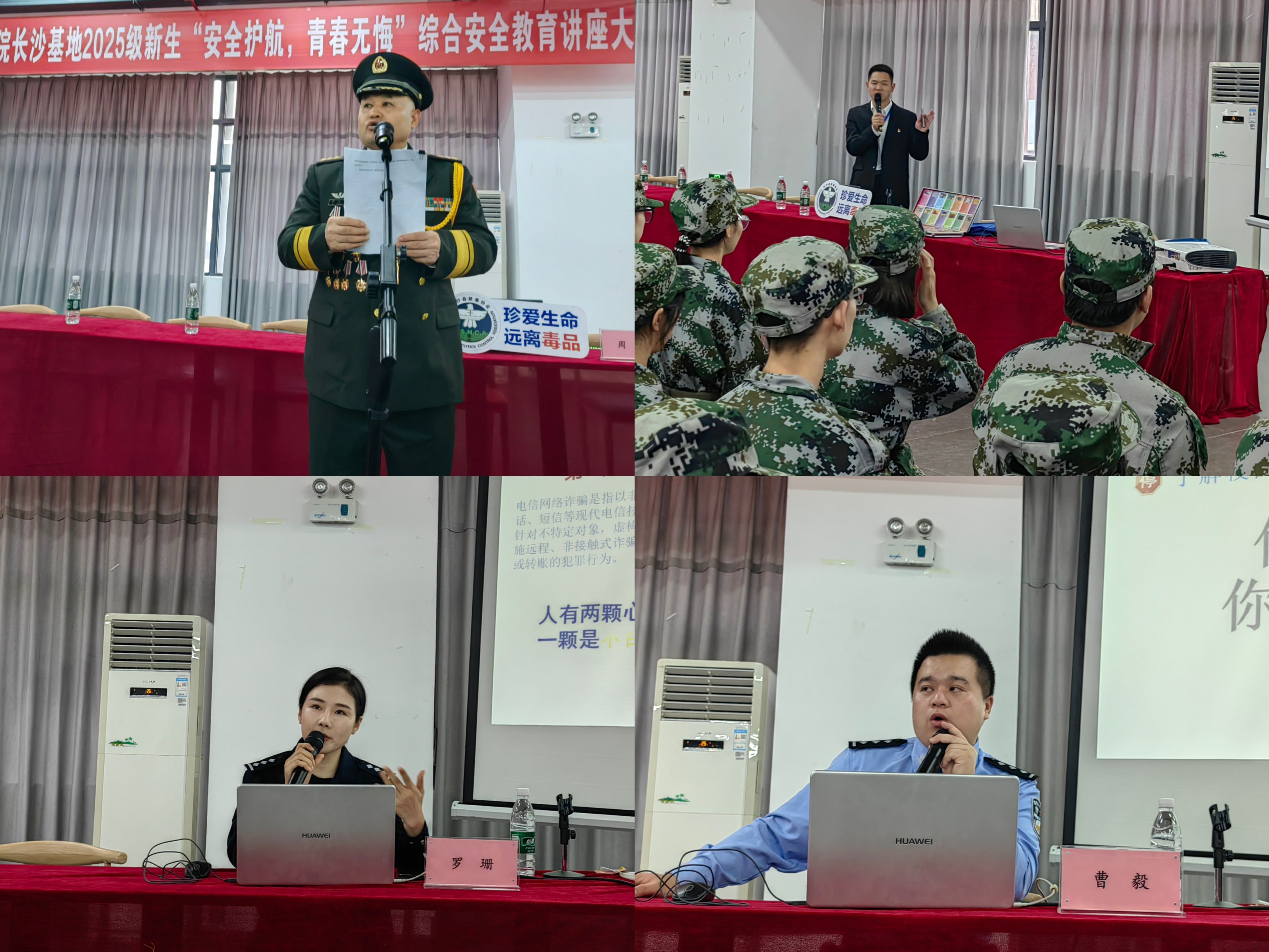 为提高学校师生安全防范意识与自我保护能力,学校长沙基地于9月25日下午面向全体新生开展了“国安+反诈+道路交通+禁毒”安全教育讲座,活动特别邀请了作训工程师许生念,长沙县公安局反诈中心主任罗珊、县公安局交通管理大队警官曹毅、县禁毒协会禁毒宣讲团讲师周军进行讲授。湘龙街道办事处、湘龙派出所、科教园服务与实训中心等相关工作人员及新生辅导员、教官参加此次活动。