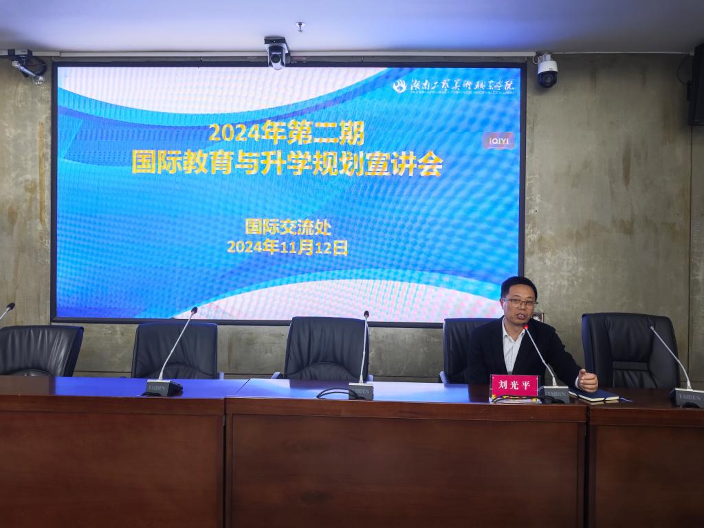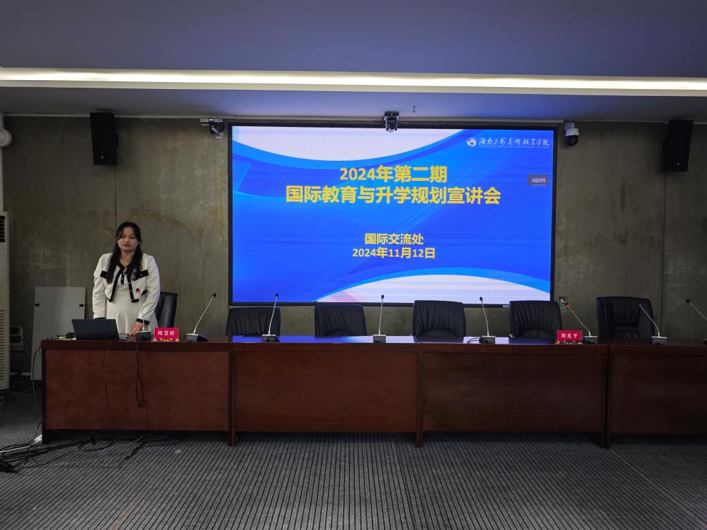 11月12日,学校国际交流处在致美楼206会议室举行2024年第二期国际教育与升学规划宣讲会。泰国格乐大学中国湖南事务中心副主任周慧婷进行了国际教育与升学规划宣讲。学校国际交流处处长刘光平主持宣讲会,部分二级学院党总支书记、专职副书记出席,学校国际交流处相关工作人员以及100余名在校生参加宣讲会。